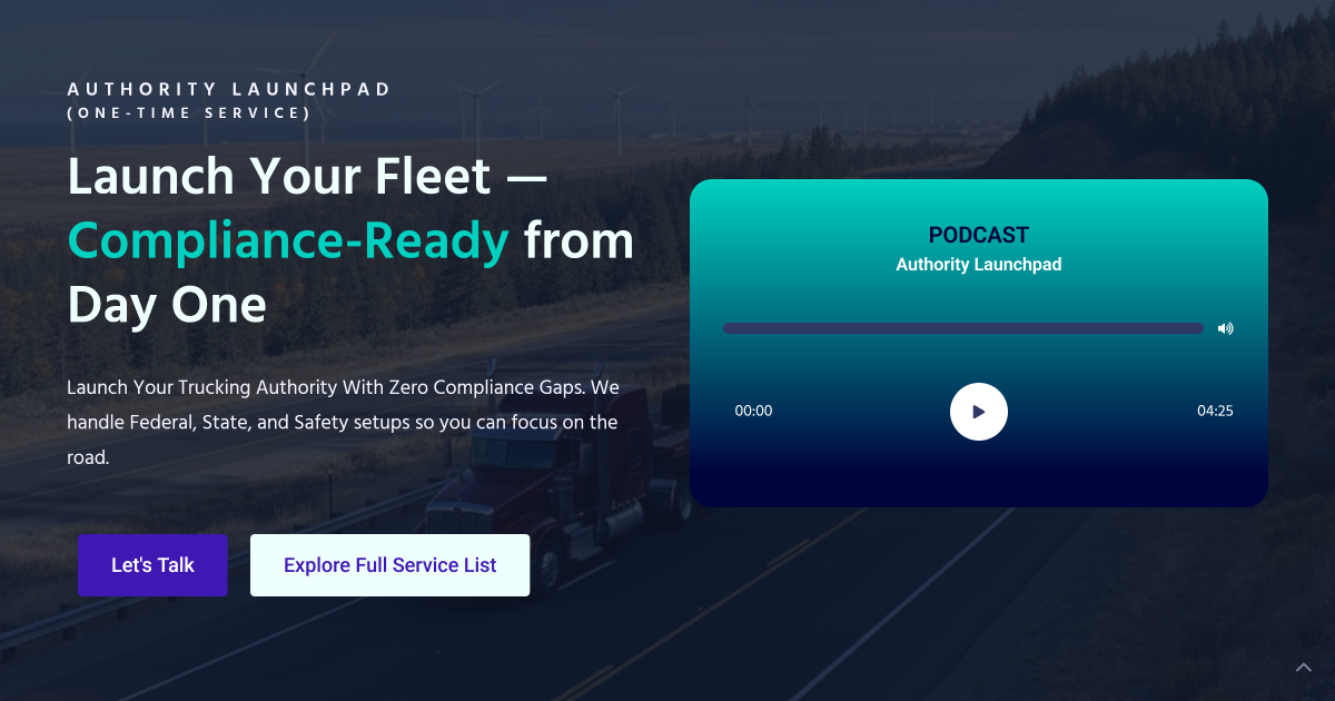 Launch Your Trucking Authority With Zero Compliance Gaps. We handle Federal, State, and Safety setups so you can focus on the road.