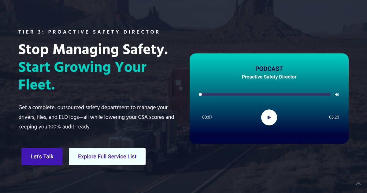 Get a complete, outsourced safety department to manage your drivers, files, and ELD logs—all while lowering your CSA scores and keeping you 100% audit-ready.